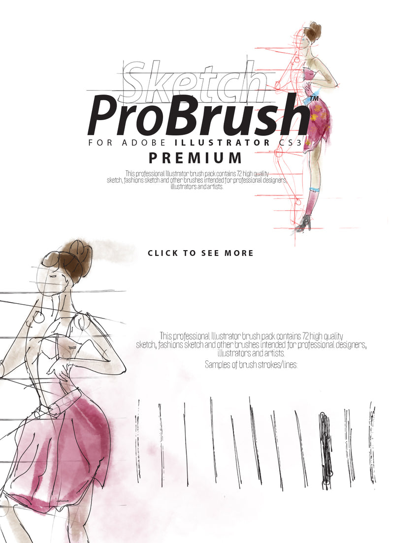 This professional Illustrator brush pack contains 72 high quality handmade sketch and fashions sketch brushes intended for professional designers, illustrators and artists.